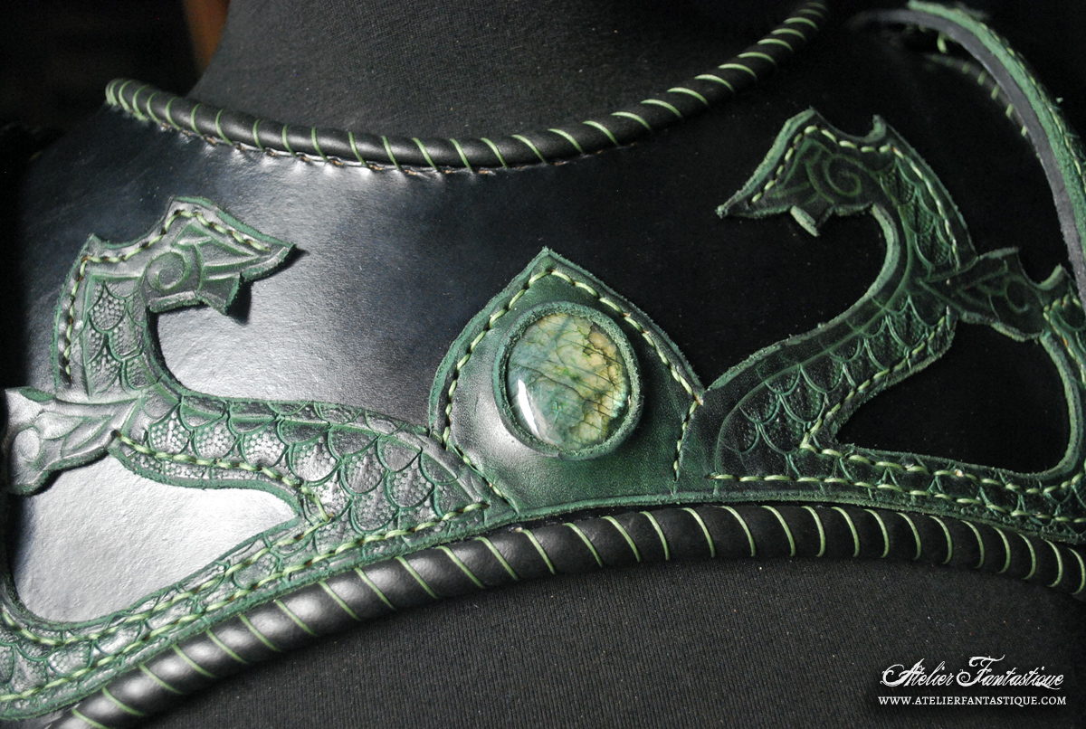 Armure en cuir pour femme, fabriquée dans du cuir de 3mm d’épaisseur tanné de façon végétale.