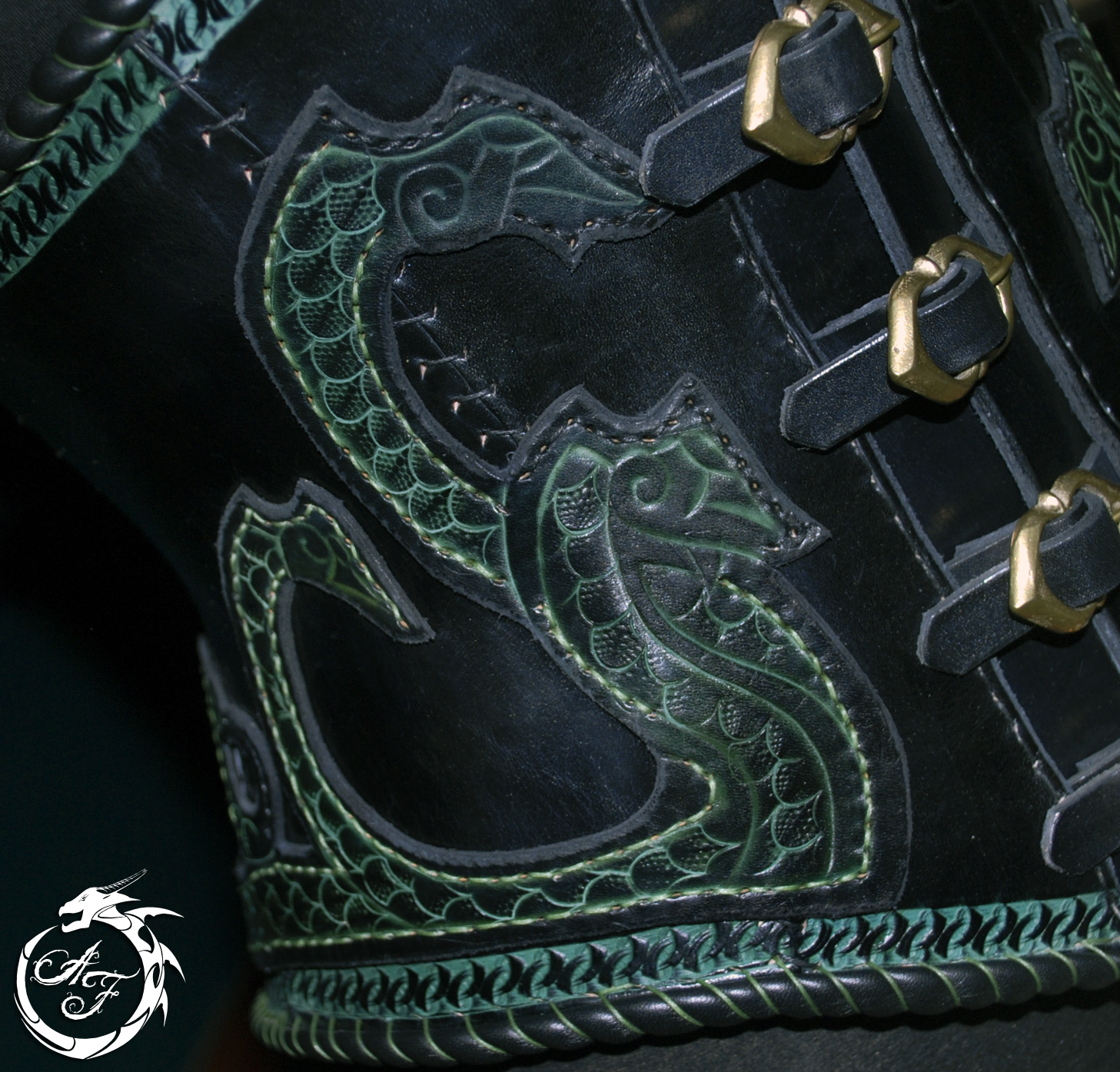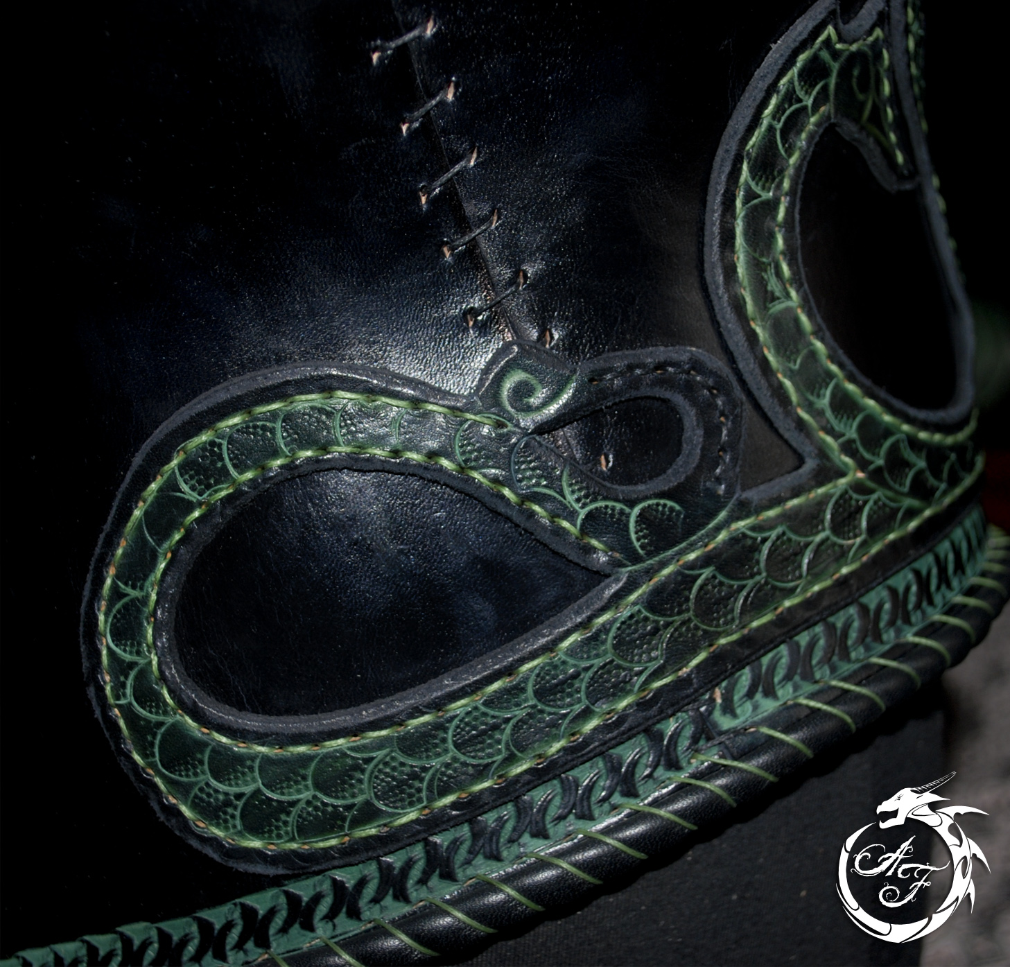Les bordures des épaulettes ainsi que les brassards sont faites dans une seconde épaisseur de cuir, entièrement embossé d’une texture écailleuse, afin de donner l’illusion d’autres serpents venant s’enrouler autour de vos épaules et de vos avant-bras.